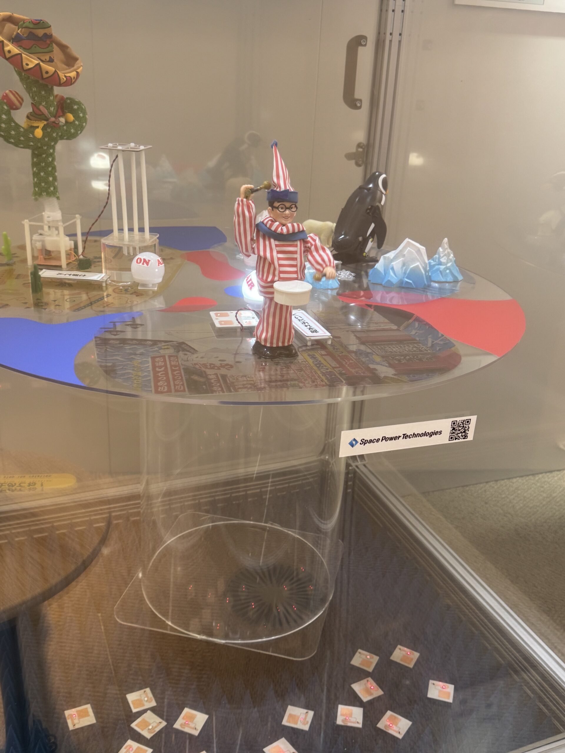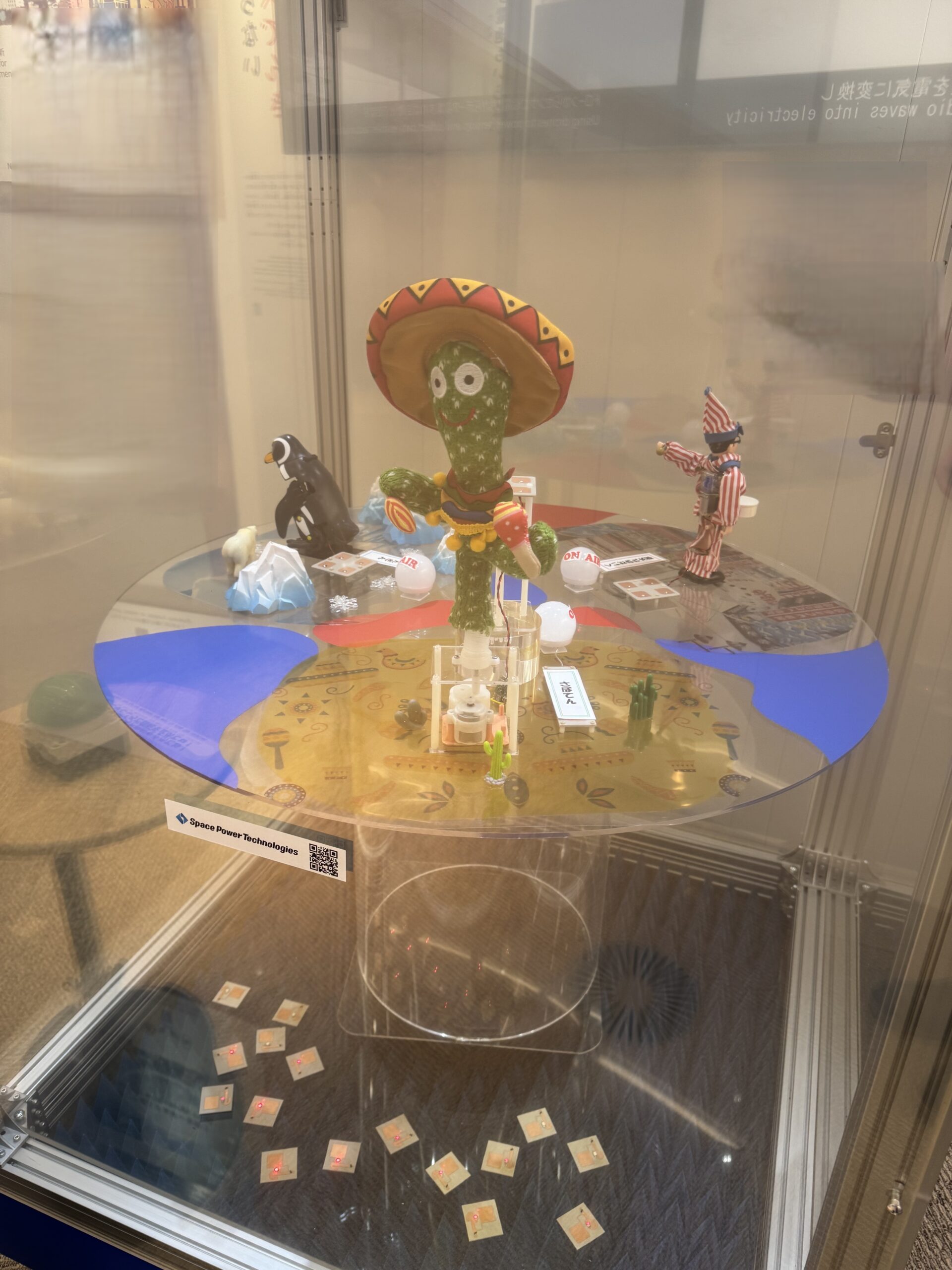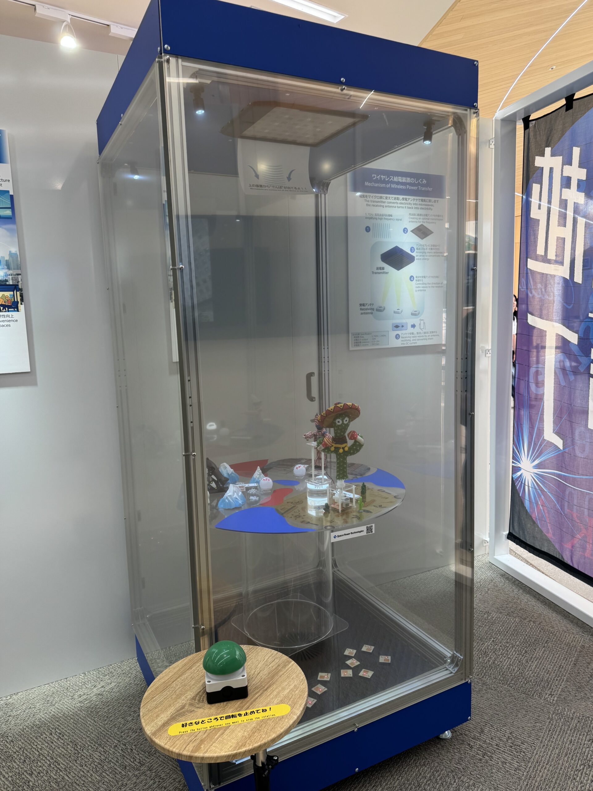 弊社は万博にて5.7GHz帯マイクロ波を用いた送受電システムの実演展示を行っています。電源配線もバッテリも無い状態で、 電波エネルギーだけで人形たちが楽しく踊りだします。